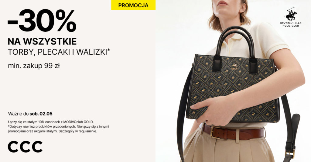 Zrób zakupy za minimum 99 zł, a za stylowe torebki, praktyczne plecaki i modne walizki zapłać 30% mniej! Nie przegap szansy na udane zakupy w CCC – oferta obejmuje także modele przecenione! Szczegóły w regulaminie.