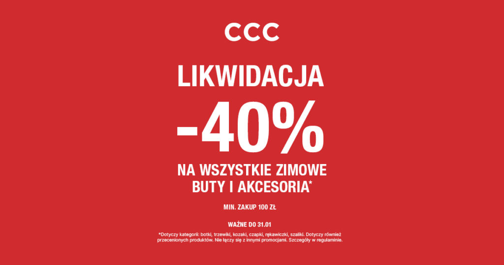 Wszystkie botki, kozaki, trzewiki i akcesoria – nawet przecenione! Rabat aż 40% przy zakupach za min 100 zł tylko do 31 stycznia. Takiej promocji w CCC nie możesz przegapić!