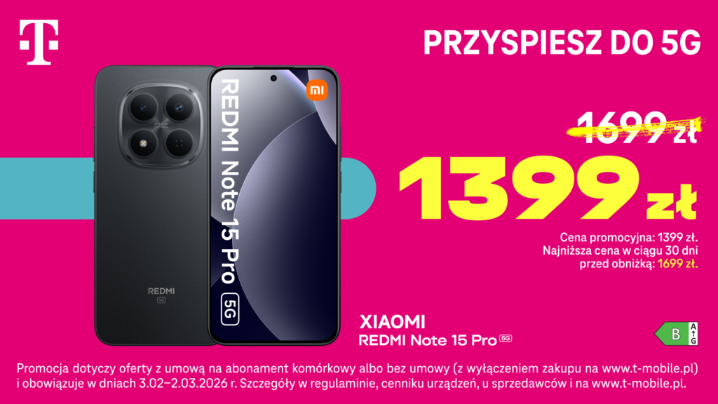 Promocja dotyczy oferty z umową na abonament komórkowy albo bez umowy (z wyłączeniem zakupu na www.t-mobile.pl) i obowiązuje w dniach 3.02 -2.03.2026r.