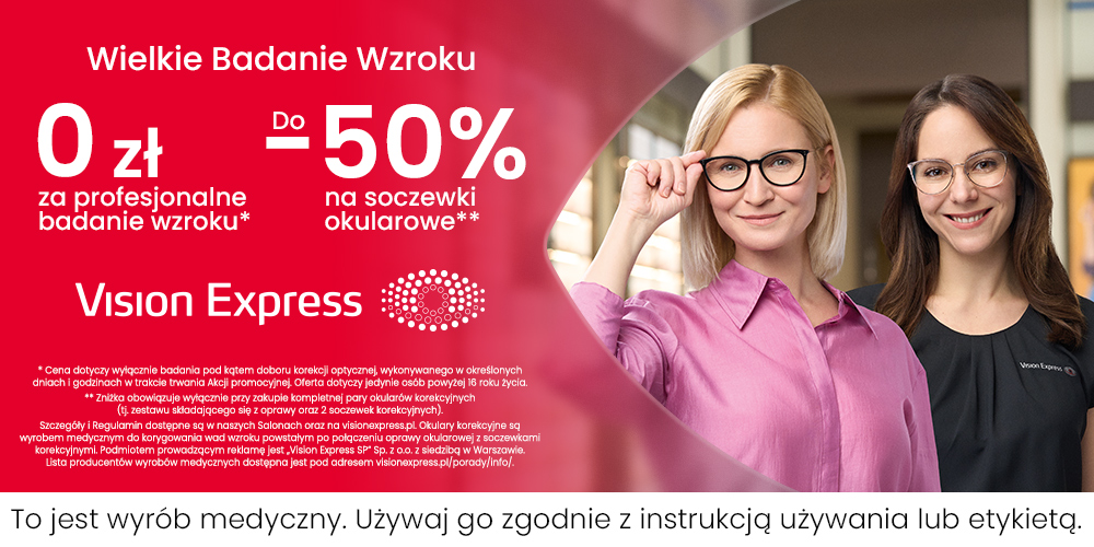 Okulary korekcyjne są wyrobem medycznym do korygowania wad wzroku powstałym po połączeniu oprawy okularowej z soczewkami korekcyjnymi. Podmiot prowadzący reklamę: „Vision Express SP” Sp. z o.o. z siedzibą w Warszawie. Lista producentów wyrobów medycznych dostępna pod adresem visionexpress.pl/porady/info/.